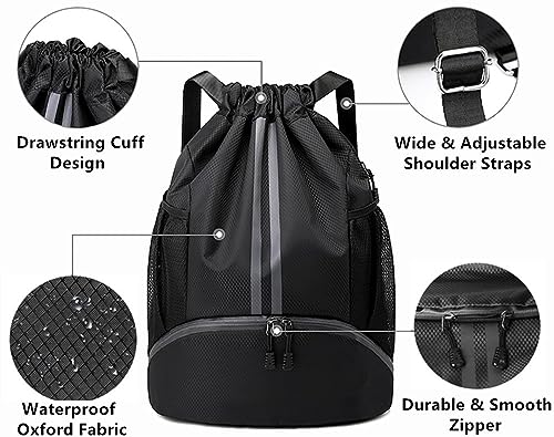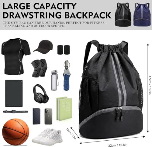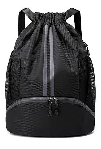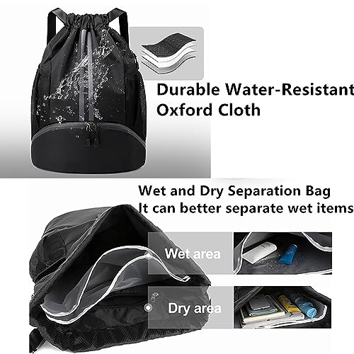 Sports Drawstring Backpack – Water Resistant Lightweight String Gym Bag with Shoes Compartment and Wet Proof Pocket for Women Men