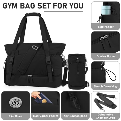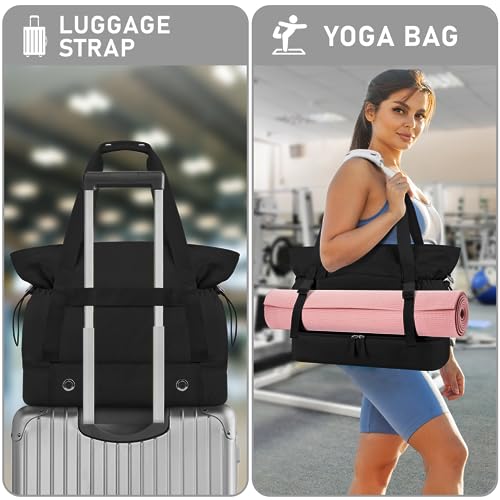 ETRONIK Gym Bag for Women, Yoga Mat Bag with Water Bottle Bag, 40L Weekender Overnight Bag with Shoe Compartment & Wet Pocket, Travel Duffle Bag Women for Yoga, Work, Hospital, Pilates and Gym, Black