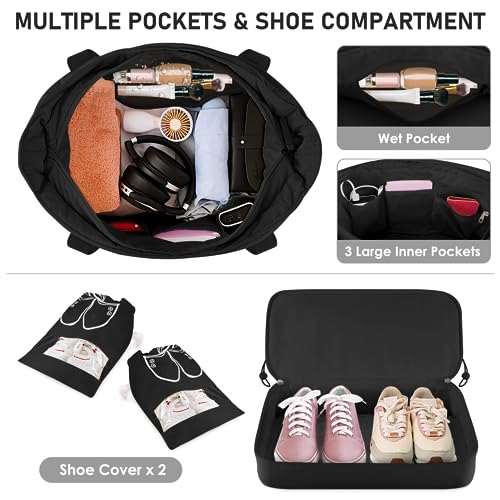 ✅【Multi-pocket & Large Capacity】The main compartment of the travel tote bag is spacious for storing clothes and items. The zippered waterproof pocket can organize wet clothes, towels and swimsuits. Separate shoe compartment with vents for shoes and dirty clothes (extra free shoe bag x 2). Drawstring design side pockets keep your small items from slipping out.