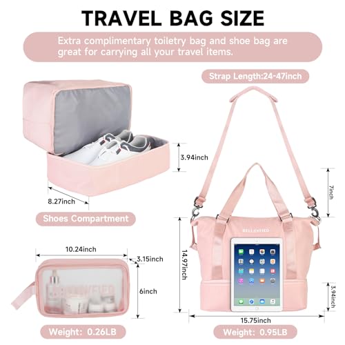 【ROOMY CAPACITY】Bellgyfied Travel Bag has three multiple internal and one external organizational pockets, which ensure you are placed more scientifically and orderly. Ordinary size : 15.75*8.27*10.24(L*W*H)inches, Expansion Dimension: 15.75*8.27*14.96(L*W*H)inches. Extra complimentary toiletry bag and shoe bag, it has a high capacity of 35L that can store both 6 to 8 pieces of summer clothes, Cosmetics, toiletries, wallets, keys, earphones, mobile power, mobile phones, files, shoes, bottles, tissue, etc.