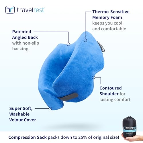 TRAVELREST Nest Memory Foam Travel Pillow/Neck Pillow – Advanced Neck Support for Long Flights – Patented Design for Optimal Relaxation – Long Travel – Unmatched Sleep – Machine Washable – Blue