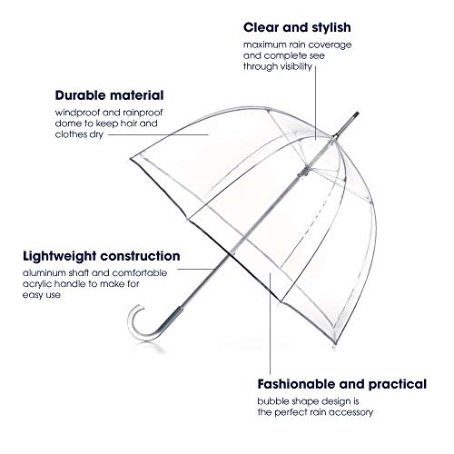 Get a clear view on the world with the Classic Clear Bubble Umbrella by Totes. This super clear PVC umbrella has a canopy arc of 52 inches open with a generous 17 inches of headroom providing extra rain protection while allowing you to see clearly. Designed with a classic J shaped handle it is easy to carry. The timeless look of this classic style makes this umbrella the perfect gift. You will be able to face any weather and still stay looking great. Please note that when you first open your umbrella you will see a fine powdery film coating the interior of the umbrellas canopy. This has been done intentionally by the manufacturer in order to maintain the integrity of the canopy while the umbrella is being stored in the warehouse. To remove the film simply wipe off the interior with a dry rag and enjoy.